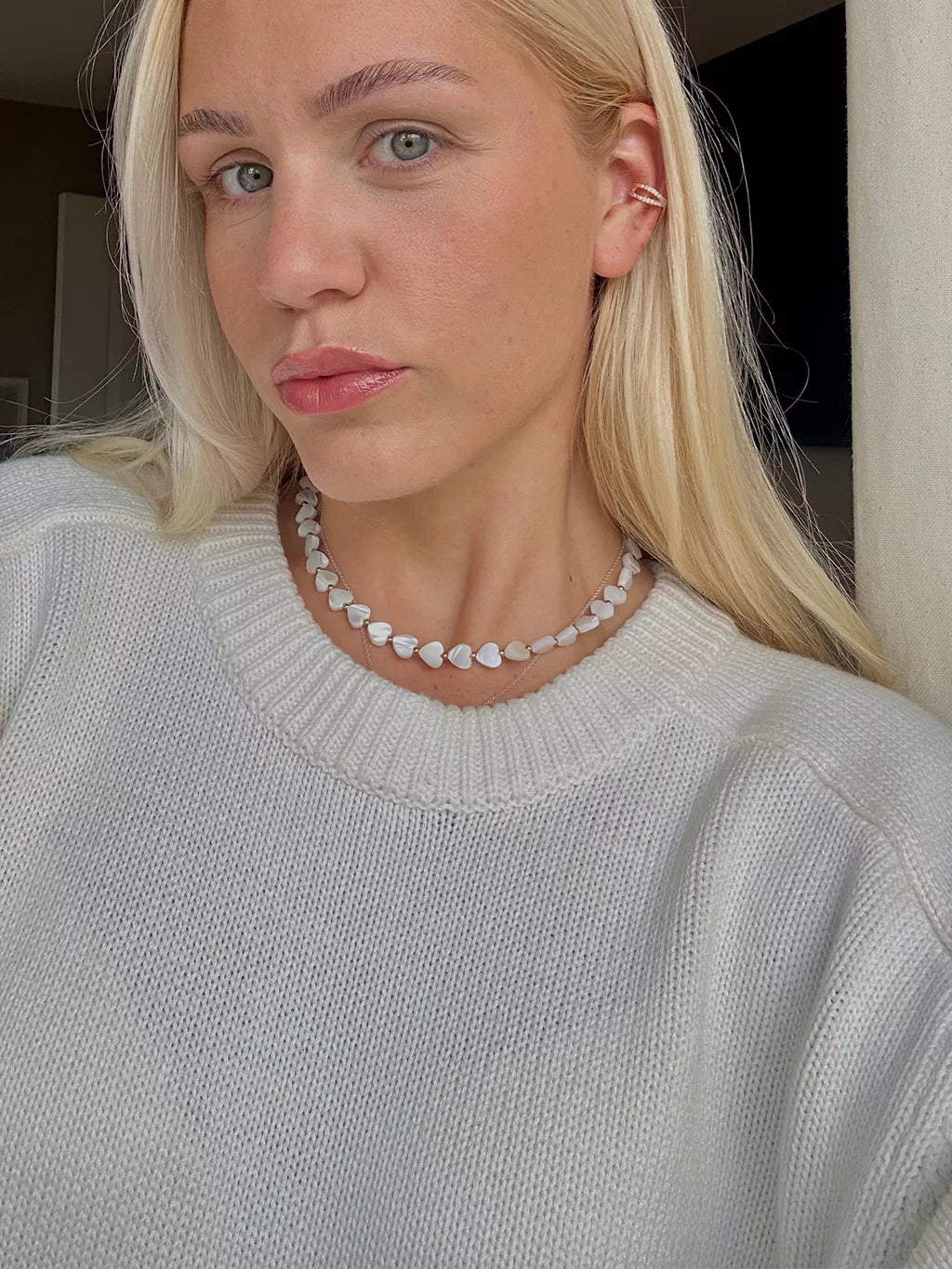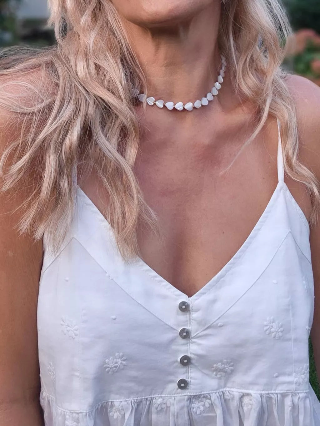 Die Heart White Shells With Gold Bead Kette besteht aus zarten weißen Muschelherzen, die mit eleganten Goldperlen akzentuiert sind. Ein bezauberndes Stück, das jedem Outfit Küsteneleganz und einen Hauch Romantik verleiht.