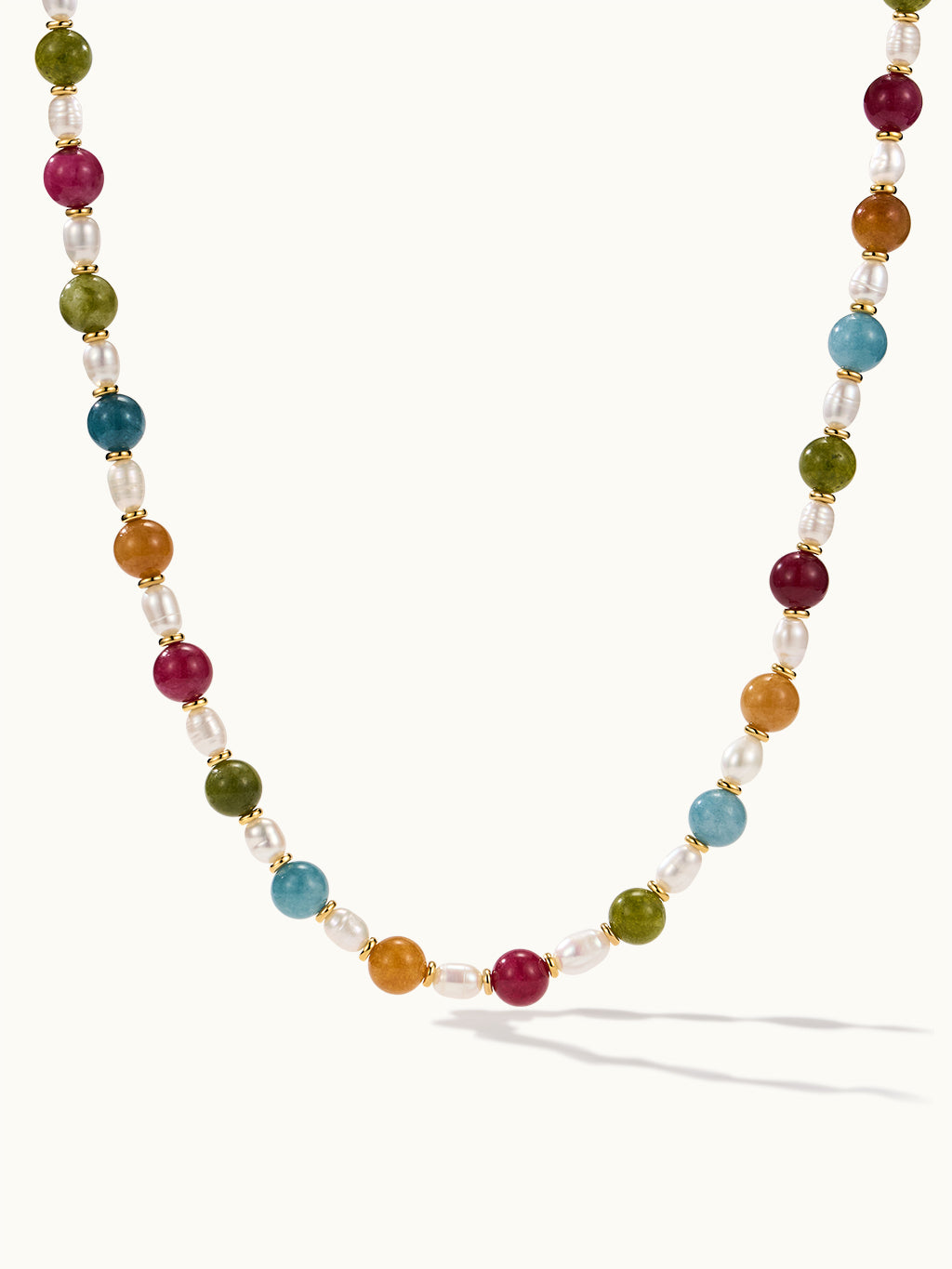 Die Rainbow Freshwater Pearl Bead Kette besticht durch glänzende Perlen in sanften Regenbogentönen und verleiht einen verspielten und zugleich eleganten Look. Perfekt, um jedes Outfit mit einem Hauch von Farbe und Charme aufzupeppen.