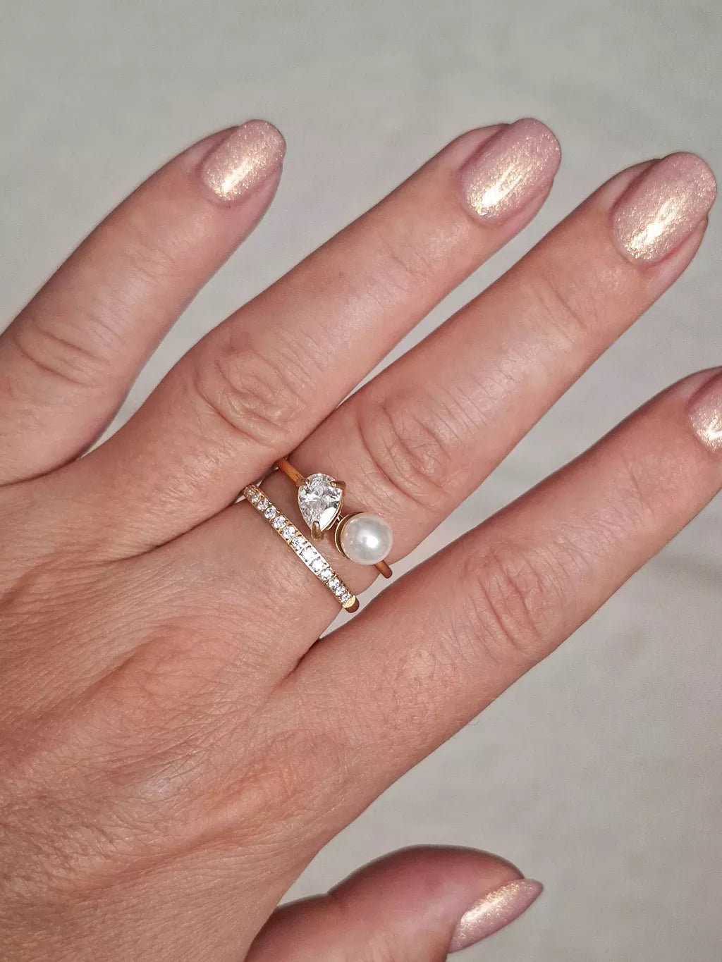 Der Teardrop Zirkonia Pearl Ring kombiniert eine leuchtende Perle mit einem funkelnden Teardrop-Zirkonia und bietet zeitlose Eleganz mit einem modernen Touch.